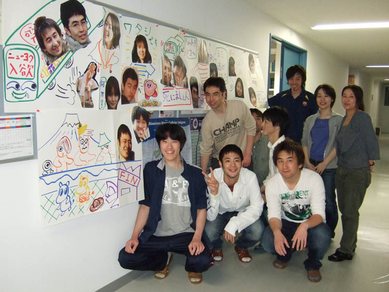 例年、4月に花見を兼ねて、新人も旧人も一緒にガイダンス。教室の歴史から、危険物の取扱い、試薬注文方、係の分担など午前中に真面目な会議。午後は御殿下グランド一杯を使ってソフトボール。夜は飲み会。すき焼き、カニシャブ、鰹のたたき。そして演芸と盛りだくさん。今年の主題は「推測しあう研究者達。。。」「星占いを毎朝欠かさずしてそうな人誰?」「かくれんぼして、上手く隠れたけど、誰にも探してもらえない人誰?」「のどかな湖畔の森を、麦わら帽子をかぶって歩いてそうな人誰?」という具合の投票。27票の投票結果の発表。しかし、うちのレクレーション係は本当に偉い!